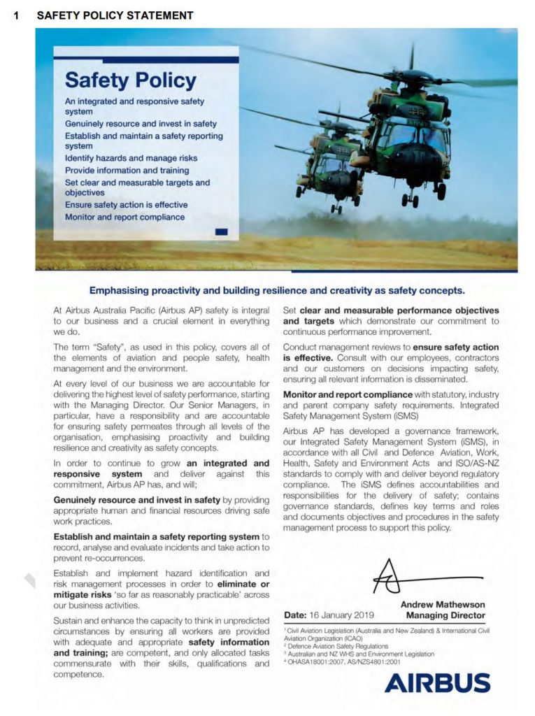 The safety policy may refer to other company policies. For example, QMS, WHS, environmental or security management systems. When written, the safety policy needs to be prominently displayed, visible for the whole workforce, and systematically reviewed and amended to reflect current work practices.