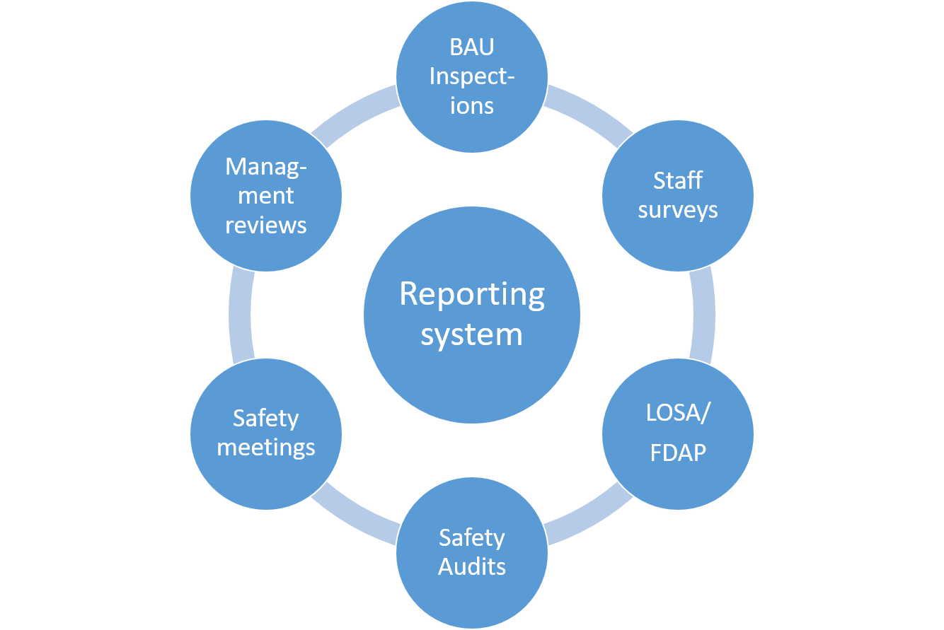 There are numerous ways to measure and monitor safety, but a mandatory and voluntary reporting system is critical.  Combined with a fair and just culture, hazard and incident reporting provides steady input, and a reliable database for the risks an organisation is exposed to.
